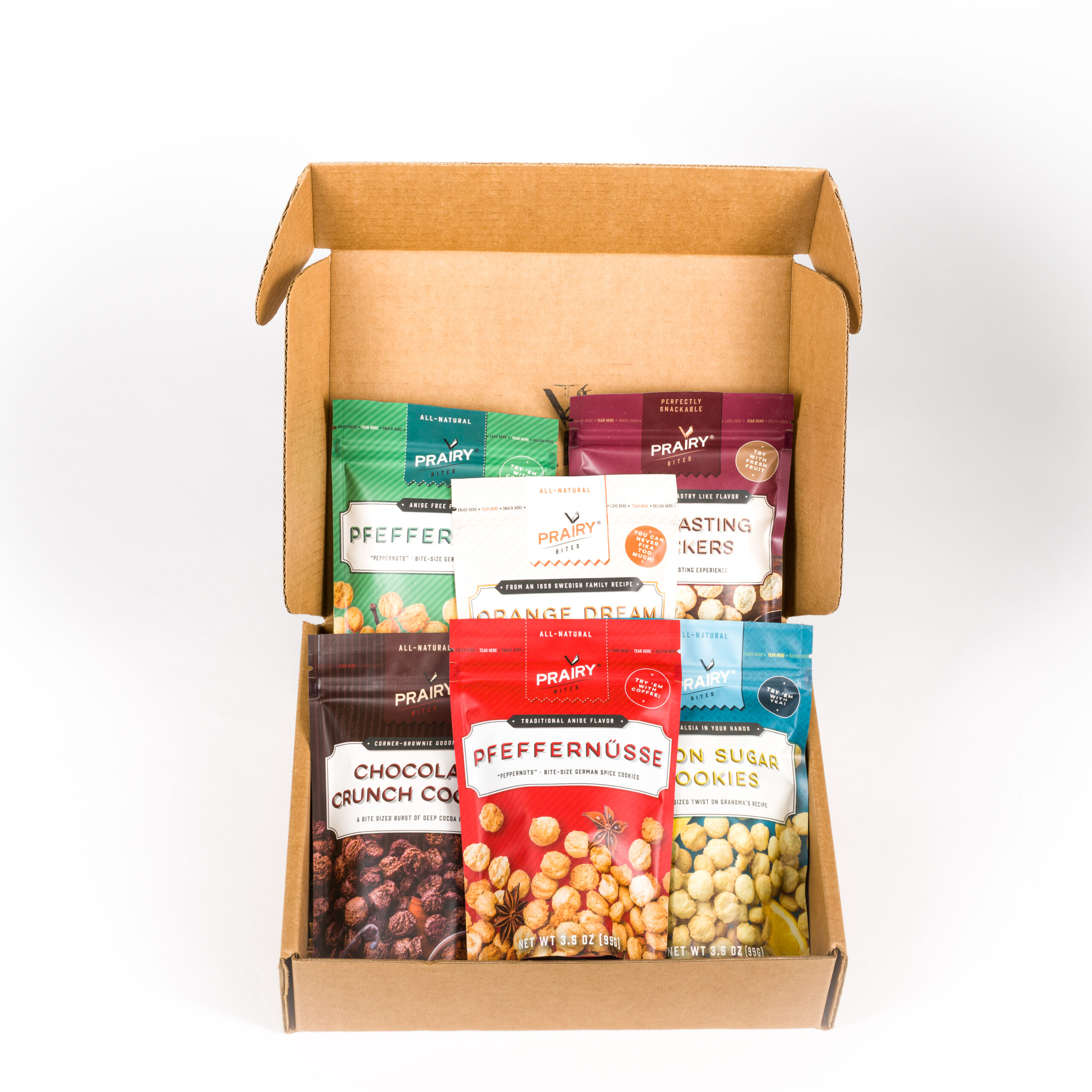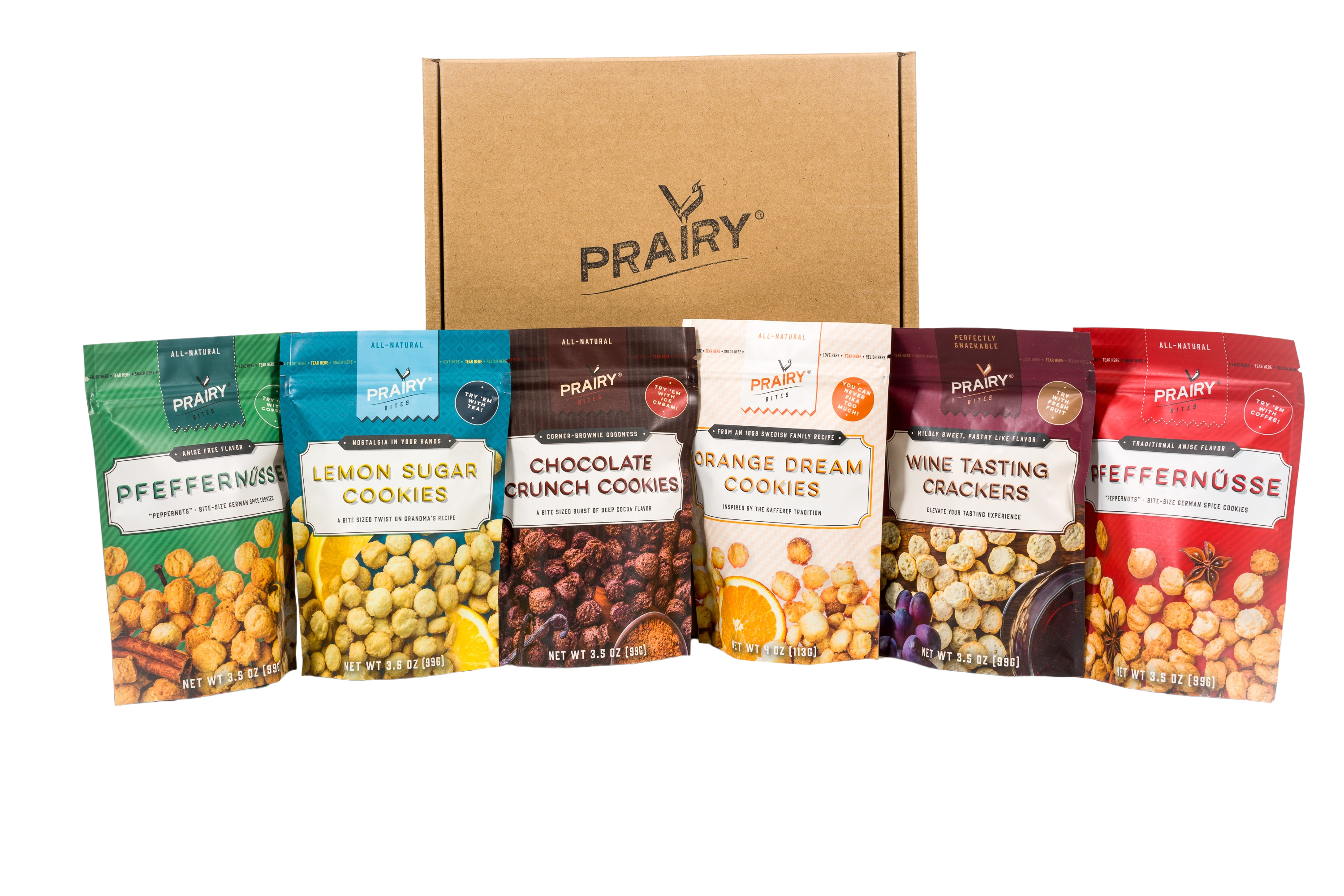 Sampler pack of our small sized bags of Prairy Bites. Try all six flavors of these delicious bite sized treats: one bag each of our Traditional Peppernuts, Anise Free Peppernuts, Chocolate Crunch Cookies, Lemon Sugar Cookies, Orange Dream Cookies, and Wine Tasting Crackers!