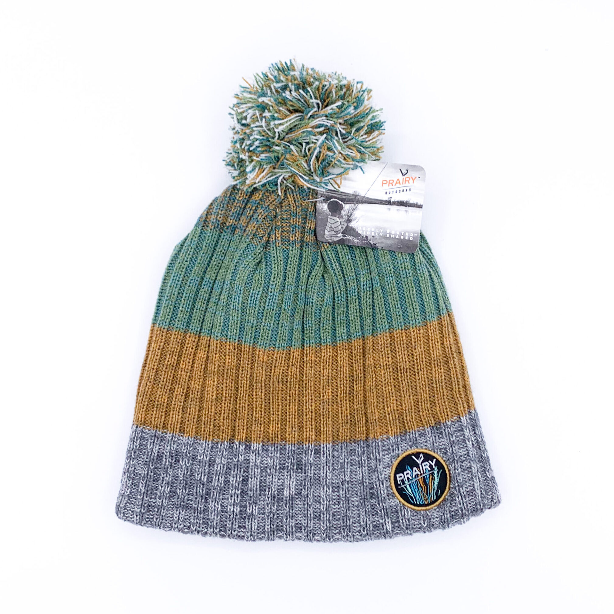 This striped, ribbed knit beanie features a matching pom and an off-center woven patch.