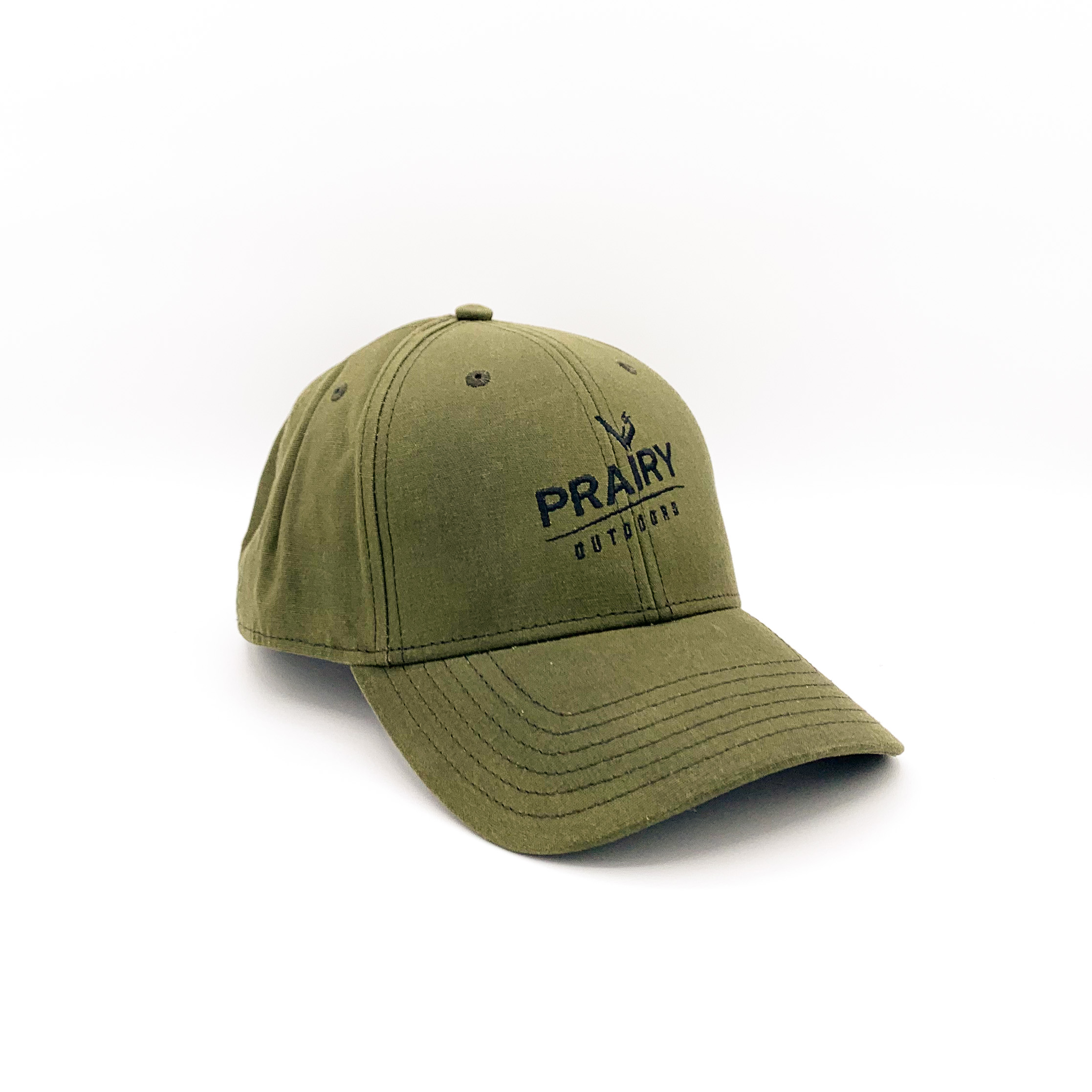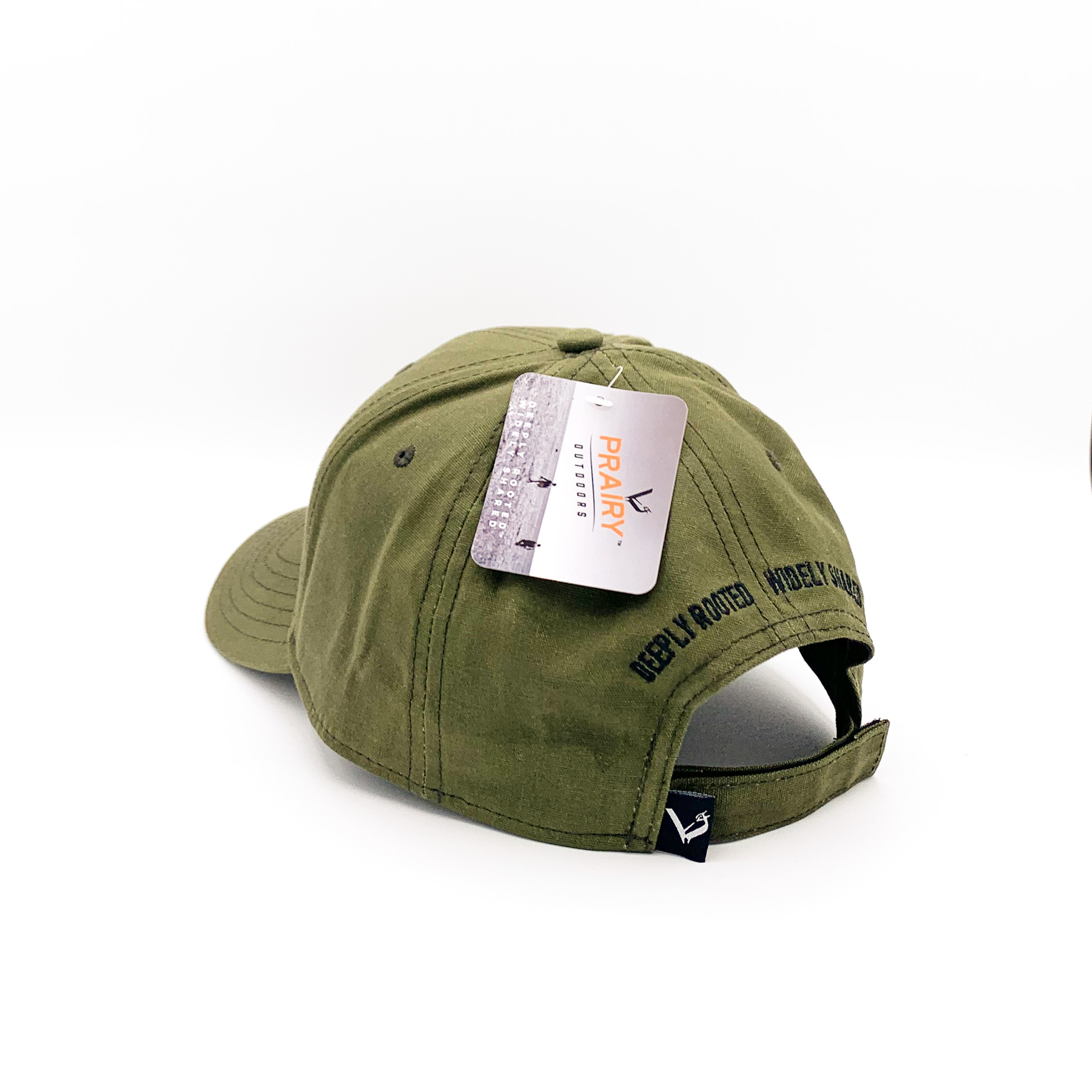 Water resistant waxed cotton canvas with a hook and loop closure adjusts to one size fits most. Our dark olive 6-panel cap features the Prairy slogan DEEPLY ROOTED, WIDELY SHARED embroidered across the back.